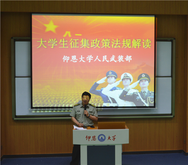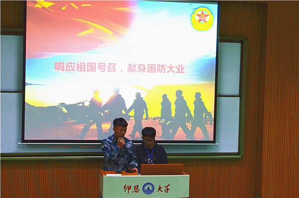 大会中,退伍复学同学苏加煜向同学们介绍了自己当兵两年的亲身经历,并结合视频让同学们真实了解部队生活。期间,薛军楼传达各级政府机关对征兵工作的重视,详细介绍征兵工作流程以及2018年各项优先与奖励政策的实施,并着重强调了征兵入伍的义务性及光荣性,让学生们进一步了解征兵工作内容。此外,薛军楼就各项征兵事宜为同学们答疑解惑,现场气氛活跃,同学积极提问。