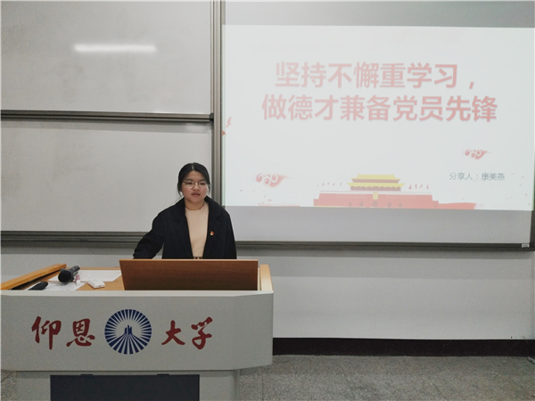 本次学习会以“坚持不懈重学习,做德才兼备党员先锋”为主题,从增强支部党员对学习的积极性和主动性等方面进行展开。会上,王艺宝、康美燕等同志分别从“为什么要坚持不懈地学习”和“陈云同志重视学习的事例”入手,讲述了作为大学生党员,应该努力学习掌握科学知识,提高内在素质,锤炼过硬本领,使自己的思维视野、思想观念、认识水平跟上与时俱进的时代。