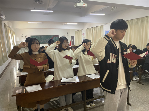 (会议现场图) 会议伊始,刘涛同志通报了到会党员人数,到会人数符合党章的相应规定。随后8位预备党员依次进行发言,并由入党介绍人以及与会党员分别对他们一年预备期的表现进行总结评价,并就是否同意转正表明了自己的意见。之后由到场的正式党员进行无记名投票表决,通过张玮菁、张华升、陈丽敏、蔡华敏、许雪津、罗宇航、梁悦、林晓榕8名预备党员转为正式党员的申请。会议最后一项,在罗宇航同志的带领下,八名同志面对党旗郑重宣誓。