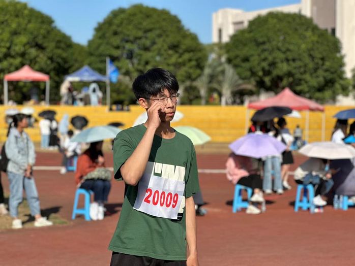 赛前,郑培源认真热身,积极为比赛做准备。比赛期间,郑培源微微弯曲身体,双眼衡量着预想的落点,跑出速度,跳出高度。最后,经过紧张的比赛,郑培源不负众望,喜得第七名的佳绩。
