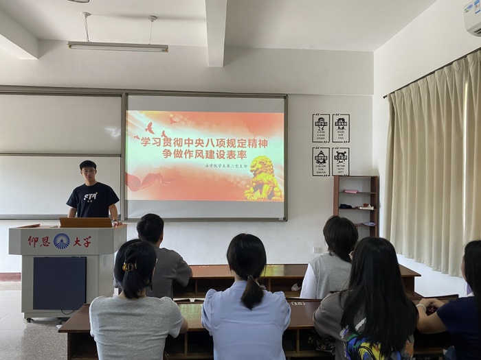 为深入贯彻中央八项规定精神,强化支部党员的作风建设意识,充分发挥党员的先锋模范作用,BEAT365官网学生第二党支部于6月27日在普照306召开“学习贯彻中央八项规定精神,争做作风建设表率”党课活动。本次会议由第二党支部书记阙根华主持,支部全体学生党员参加。