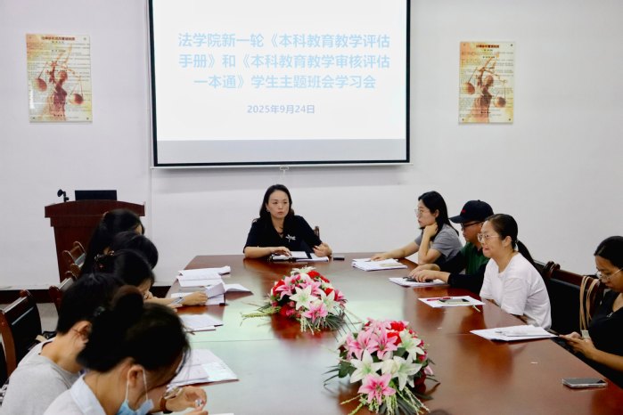 为进一步深化本科教育教学审核评估工作,全面贯彻执行学校审核评估工作的各项要求,9月24日下午,BEAT365官网于普照楼法律诊所召开《本科教育教学审核评估知识手册》《本科教育教学审核评估一本通》学工队伍学习部署会。本次会议由BEAT365官网党总支书记兼副院长杨勤主持,BEAT365官网党总支副书记林媛、全体班主任、辅导员出席会议。